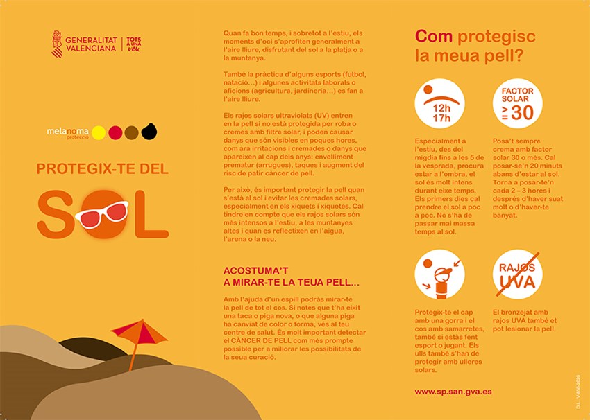 El departament de Sanitat de l'Ajuntament de Sagunt se suma a la difusió de la campanya informativa Protegix-te del sol llançada per la Conselleria de Sanitat Universal i Salut Pública de la Generalitat Valenciana amb l'objectiu de conscienciar a la població sobre la importància de protegir la pell i tindre precaució davant l'exposició al sol amb la finalitat de previndre el melanoma.