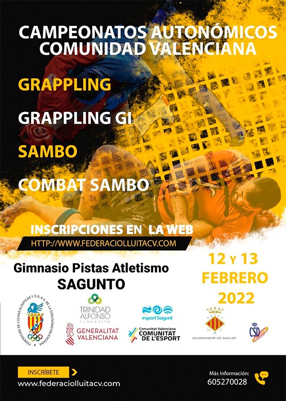 El pròxim cap de setmana, 12 i 13 de febrer, es disputaran a Sagunt els Campionats Autonòmics de les modalitats esportives de lluita: Grappling, Grappling Gi, Sambo i Combat Sambo, en el pavelló interior del Poliesportiu Municipal (internuclis) de Sagunt. L'esdeveniment està organitzat pel Club de Lluita Camp de Morvedre i la Federació de Lluites Olímpiques de la Comunitat Valenciana en col·laboració amb el departament d'Activitat Física, Salut i Esports de l'Ajuntament de Sagunt.