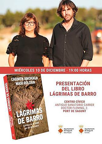 Carmen Amoraga i Maxi Roldán presenten ‘Lágrimas de Barro’. Els beneficis recaptats amb el llibre aniran destinats íntegrament a les persones afectades per la DANA. Este esdeveniment literari de caràcter solidari està programat per a este dimecres 10 de desembre a les 19 hores en el Centre Cívic Antic Sanatori del Port de Sagunt.