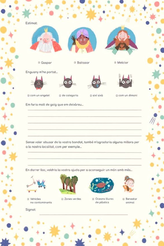 La carta inclou en la part interior dibuixos amb vocabulari bàsic en valencià i un espai perquè els xiquets i xiquetes facen les seues peticions personals a Melcior, Gaspar i Baltasar, però també inclou uns apartats més solidaris amb bons desitjos i millores per a la ciutat i per al món. A més, es disposa de la versió en blanc i negre per a ser acolorida i traure més profit de l’activitat.