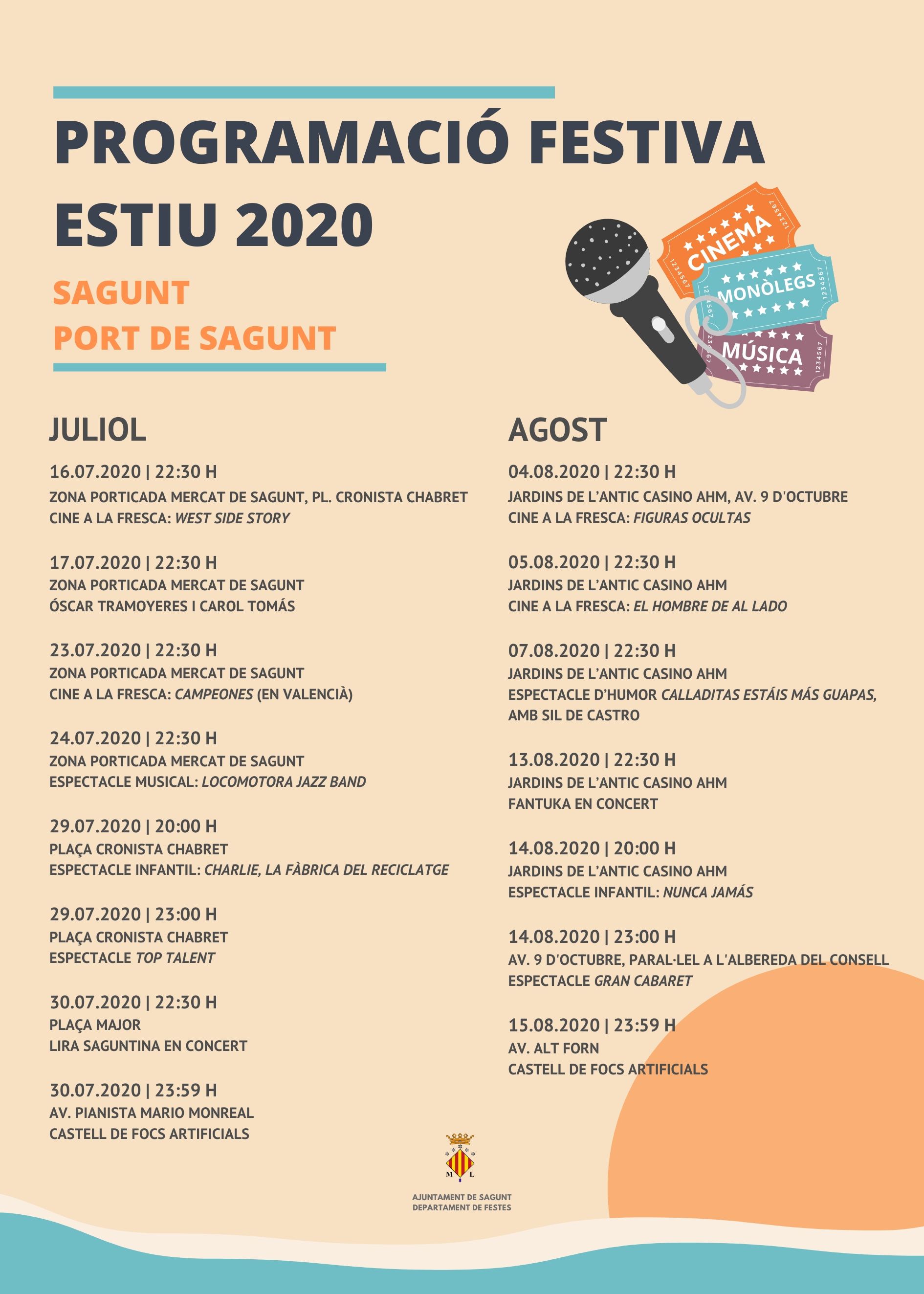 Des del 16 fins al 30 de juliol les activitats es desenvoluparan en el nucli de Sagunt ciutat i de l'1 al 15 d'agost en el nucli del Port de Sagunt. Estes activitats aniran des de cinema a l'aire lliure, amb pel·lícules com West Side Story, Campeones o El hombre de al lado, fins a espectacles d'humor, amb Oscar Tramoyeres, Carol Tomás o Sil de Castro, i musicals, tant infantils com per a adults, en la zona porticada del Mercat de Sagunt, als Jardins de l'Antic Casino AHM, en la plaça Cronista Chabret, en l'avinguda 9 d’Octubre o en la plaça Major. Per totes estes activitats se seguiran les mesures sanitàries i d'aforament necessàries. Segons ha explicat la regidora, la manera de regular l'aforament mitjançant invitació anticipada es donarà a conéixer durant els pròxims dies.