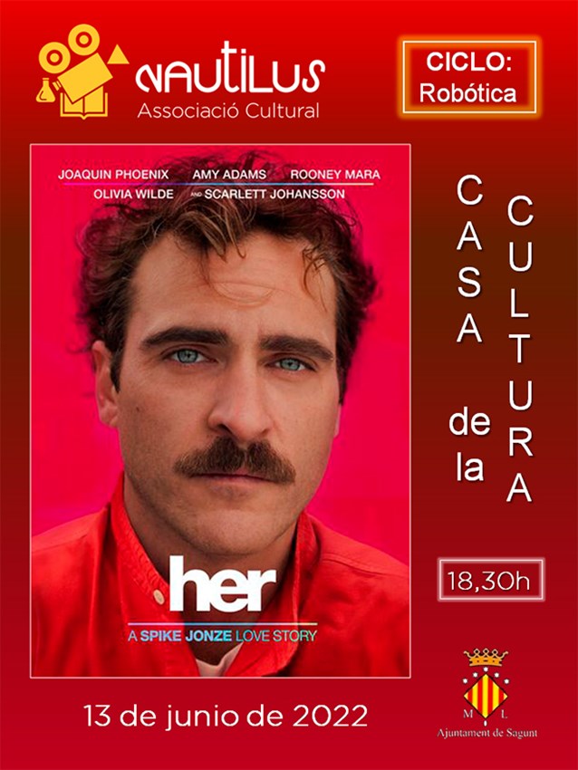 Este dilluns a la vesprada, a les 18.30 hores, arriba un nou capítol dels Dilluns de Nautilus amb la projecció de la pel·lícula Her (2013), com a part del cicle cinèfil dedicat a la robòtica i intel·ligència artificial, promogut per l'Associació Cultural Nautilus amb la col·laboració de l'Ajuntament de Sagunt a través de la Regidoria de Cultura.