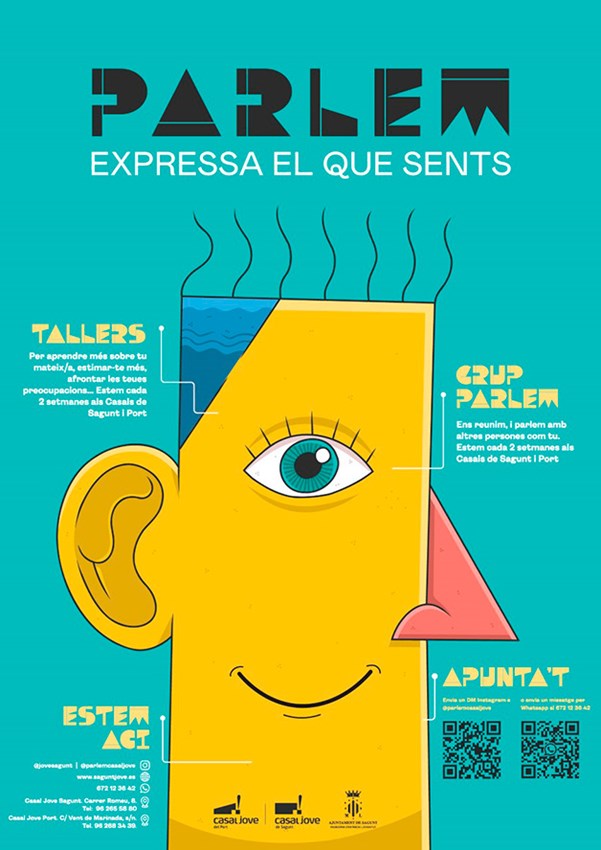 Finalment, els TALLERS PARLEM són sis tallers gratuïts on es treballen «l'autoestima, el control de les emocions i les xarxes socials». Seran els dijous, de manera quinzenal, de 17.00 a 18.30 hores en els Casals Jove de Sagunt i Port de Sagunt. Estan dirigits a persones joves entre 12 i 18 anys. Respecte als tallers, estos seran: “¿Cómo nos sentimos?” (13 d’abril), “Quiérete” (27 d’abril), “Vigilantes de la vida” (11 i 25 de maig), “Relájate y disfruta” (8 de juny) y “Olvídate de los likes” (22 de juny).