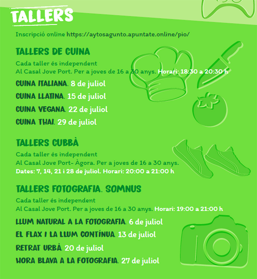 El primer dels tallers serà el de la disciplina de fitness Cubbà hui, dimarts 7 de juliol, de 20 a 21 hores en el Casal Jove. Este taller es repetirà el 14, el 21 i el 28 de juliol a la mateixa hora. A més també hi haurà tallers de cuina italiana, el 8 de juliol; llatina, el 15 de juliol; vegana, el 22 de juliol, i thai el 29 de juliol, també en el Casal Jove.