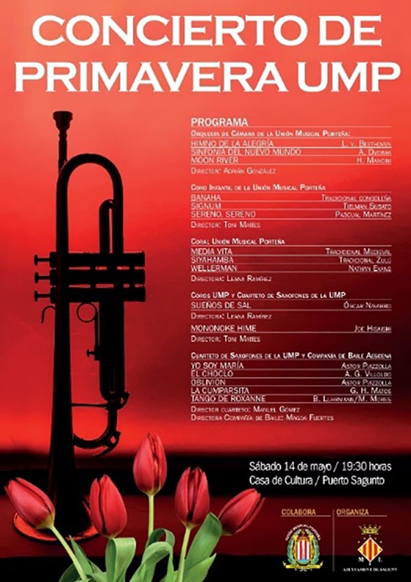 La Unión Musical Porteña (UMP) celebrarà el seu tradicional concert de primavera este dissabte, 14 de maig, a les 19.30 hores a la Casa Municipal de Cultura del Port de Sagunt. L'entrada és gratuïta.