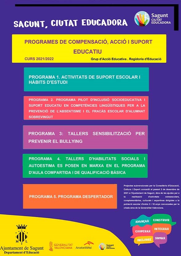 El departament d'Educació, dins del marc del projecte, ‘Sagunt, Ciutat Educadora' i a través del grup d'acció educativa, ha dut a terme durant el passat curs 2021/2022, diferents programes d'actuació orientats cap a l'acció, la compensació educativa i el suport educatiu.