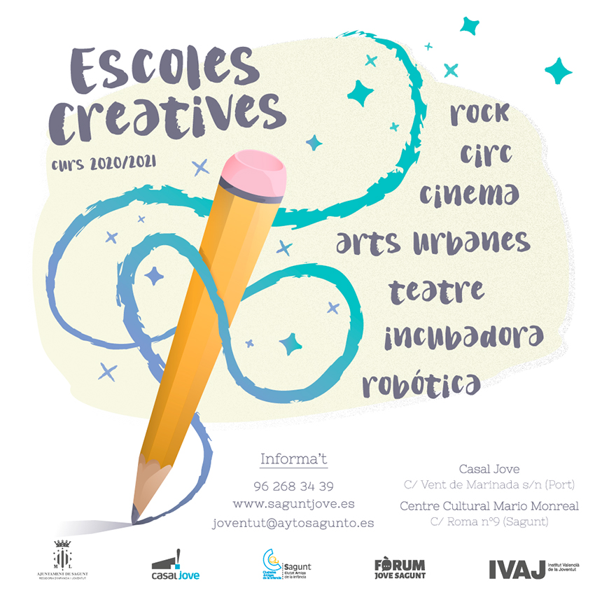 La Regidoria de Joventut i Infància de l'Ajuntament de Sagunt ha posat en marxa les Escoles creatives dirigides a la infància, a l'adolescència i a la joventut de fins a 35 anys. El pròxim curs 2020-2021 es prepara amb nombrosos tallers de set modalitats de formació artística els quals es desenvoluparan en el Casal Jove del Port de Sagunt d'octubre a maig.