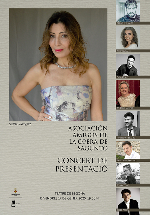 El concert comptarà amb la participació de la soprano internacional Silvia Vázquez, qui serà acompanyada per un destacat elenc d'artistes, entre ells Emmanuel Faraldo, Joana Tomeu, Josep Arnau, M. Jesús Mestre, Pedro Quiralte, Rodrigo Herrero, Viviana Salesi i Paco Cholvi. Tots ells interpretaran un variat programa d'obres dels més reconeguts compositors de l'òpera mundial, com Mozart, Puccini, Verdi i Bizet.