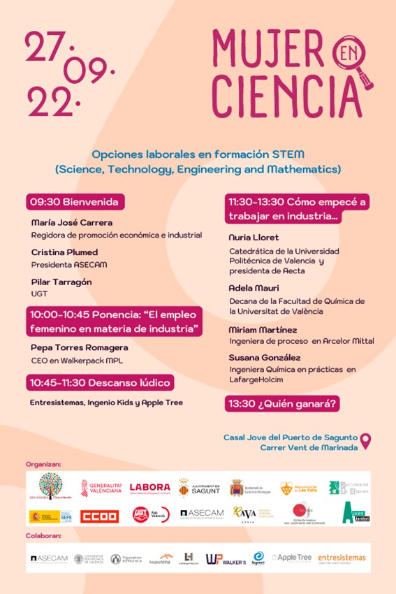 Seguidament, tindrà lloc la ponència ‘L'ocupació femenina en matèria d'indústria’ que realitzarà la CEO en Walkerpack MPL, Pepa Torres Romagera. Durant el descans lúdic, es realitzaran diferents activitats amb les empreses Entresistemas, Enginy Kids i Apple Tree. Després d'esta pausa, les persones assistents podran escoltar experiències reals sobre ‘Com vaig començar a treballar en indústria…’ en la qual participaran la catedràtica de la Universitat Politècnica de València i presidenta d’Aecta, Nuria Lloret; la degana de la Facultat de Química de la Universitat de València, Adela Mauri; l'enginyera de procés en Arcelor Mittal, Miriam Martínez; i l'enginyera química en pràctiques en Lafarge Holcim, Susana González.