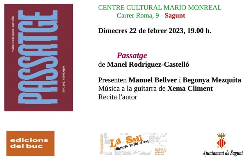 Dimecres que ve 22 de febrer a les 19.00 hores el Centre Cultural Mario Monreal acollirà la presentació del nou llibre de Manel Rodríguez-Castelló, Passatge. Este és el número 25 de la col·lecció de poesia d'Edicions del Buc. L'entrada és lliure fins a completar aforament i ho organitza el departament de Cultura de l'Ajuntament de Sagunt.