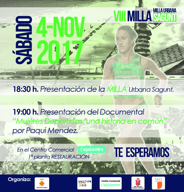 Dissabte que ve, 4 de novembre, tindrà lloc la presentació de la “VIII Milla Urbana de Sagunt”, la qual es realitzarà el dia següent, el diumenge 5 de novembre. La carrera està organitzada de forma conjunta pel departament d'Esports de l'Ajuntament de Sagunt i el centre comercial l’Epicentre. Enguany, el missatge principal de la carrera és la visibilitat de les dones i el seu paper en el món de l'esport, així com la lluita contra la desigualtat de gènere que marca este àmbit.
