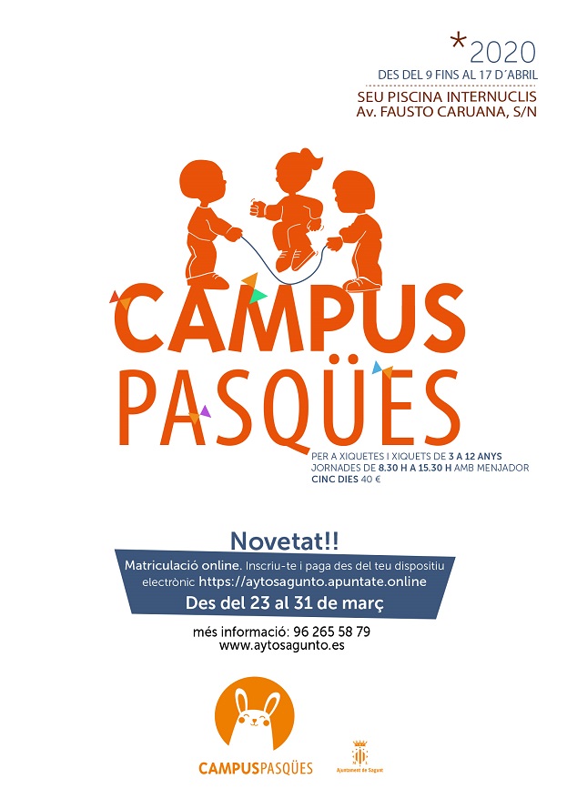 La delegació d'Esports de l'Ajuntament de Sagunt ha organitzat, del 9 al 17 d'abril, la tercera edició del Campus Pasqües. Este programa d'activitats lúdico-esportives, durant el període de vacacions de Setmana Santa i Pasqua, està destinat a xiquets i xiquetes de 3 a 12 anys. La iniciativa es desenvoluparà en el Poliesportiu Municipal (internúclis) de matins de 8.30 a 15.30 hores.
