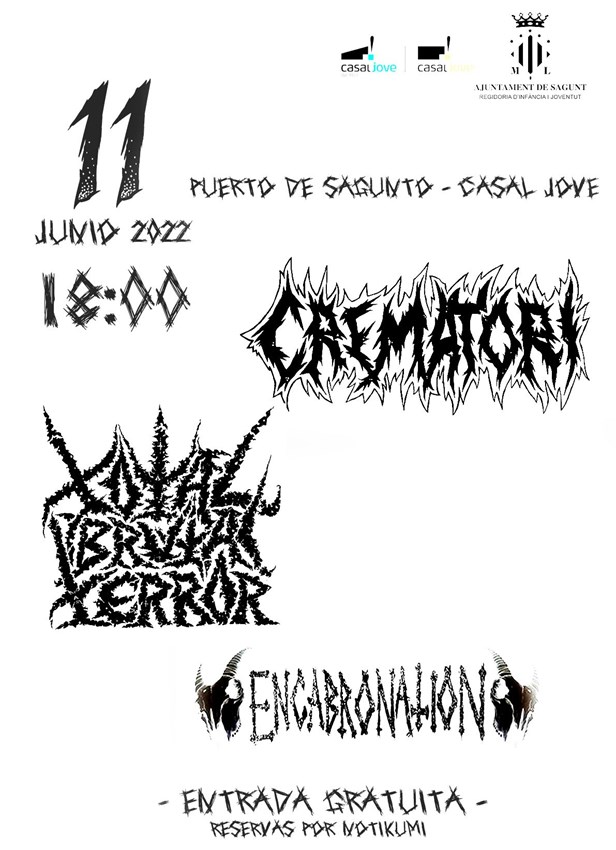 En este sentit, esta vegada és el torn de tres grups que amenitzaran la vesprada amb música metall, en el Casal Jove Port. El jove grup local Crematori, que interpretarà en el seu repertori cançons d'estil Black Trash, compartirà escenari amb els grups Total Brutal Terror amb el seu estil deathgrind i Encabronation, amb l'estil musical grindcore.