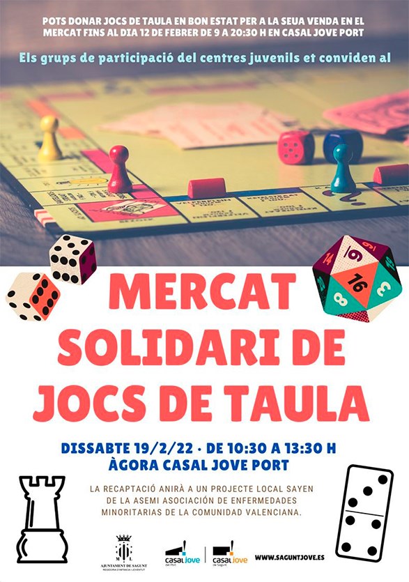 Els grups de participació dels centres juvenils del departament de Juventut i Infància organitzen el segon Mercat Solidari de Jocs de Taula, a fi de donar visibilitat al projecte Sayen, que ha nascut a la nostra ciutat, de l'Associació de Malalties Minoritàries de la Comunitat Valenciana. El mercat estarà obert el dissabte 19 de febrer, de 10.30 a 13.30 hores en l'Àgora del Casal Jove del Port de Sagunt.
