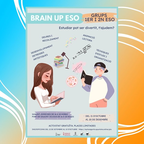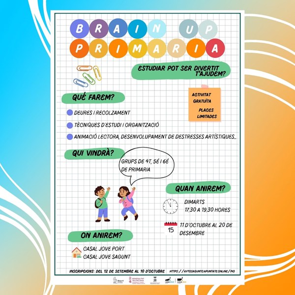 També es reprèn l’activitat de Brain Up! primària i ESO on l’alumnat de 4t, 5é i 6é de primària i de 1er i 2on d’ESO faran deures, recolzament, aprendran tècniques d’estudi, treballaran l’animació lectora i desenvoluparan destreses artístiques entre altres. En el cas de Brain Up! primària esta activitat es realitzarà els dimarts de 17.30 a 19.30 als casals joves del Port i de Sagunt des de l’11 d’octubre fins al 20 de desembre. Al Brain Up! ESO l’activitat es realitzarà al Casal Jove Sagunt els dimecres de 16 a 18 hores i al Casal Jove Port els dijous de 16 a 18 hores, de l’11 d’octubre fins al 20 de desembre. Esta activitat gratuïta amb places limitades ja té la inscripció oberta fins al 10 d’octubre a https://aytosagunto.apuntate.online/pio/?area=21.