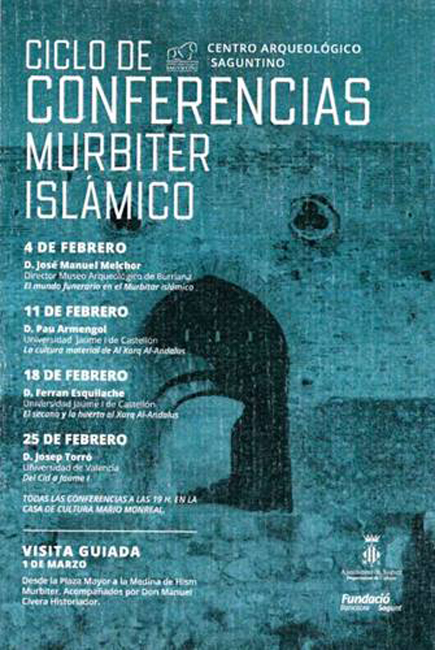 El Centre Arqueològic de Sagunt, amb la col·laboració de la delegació de Cultura de l'Ajuntament de Sagunt, presenta el cicle de conferències Murbiter Islàmic durant tot el mes de febrer. Es tracta d'un cicle de quatre conferències, que es realitzaran del 4 al 25 de febrer, i que estaran impartides per experts en l'època Al-Àndalus. Totes les conferències es realitzaran al Centre Cultural Mario Monreal a les 19 hores. L'entrada és gratuïta.