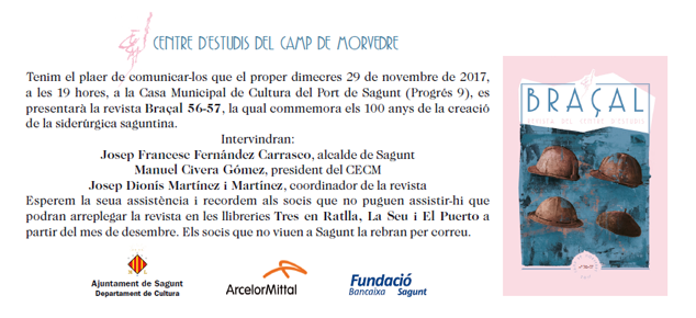 El Centre d’Estudis del Camp de Morvedre presenta un nou número de la revista Braçal. Demà, dimecres 29 de novembre, a les 19.00 hores, la Casa Municipal de Cultura del Port de Sagunt acollirà l'acte de presentació del nombre 56-57 de la publicació. La presentació està emmarcada en els actes del centenari de la siderúrgia.