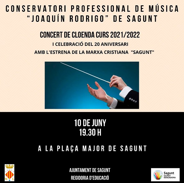 El divendres de la setmana que ve, 10 de juny, a partir de les 19.30 h el Conservatori Professional de Música Joaquín Rodrigo de Sagunt realitzarà l'acte de clausura del curs 2021/2022 en la plaça Major. A més de realitzar un concert gratuït de tres agrupacions del conservatori, també es farà lliurament dels corresponents diplomes i regals de l'AMPA a l'alumnat que ha finalitzat els estudis professionals de música.