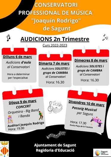 La setmana que ve, del 6 al 10 de març, l’alumnat del Conservatori Professional de Música Joaquín Rodrigo de Sagunt realitzarà les audicions i concerts del segon trimestre d’este curs, 2022-2023. A més, el divendres hi haurà un Passeig Musical per diferents localitzacions de Sagunt.
