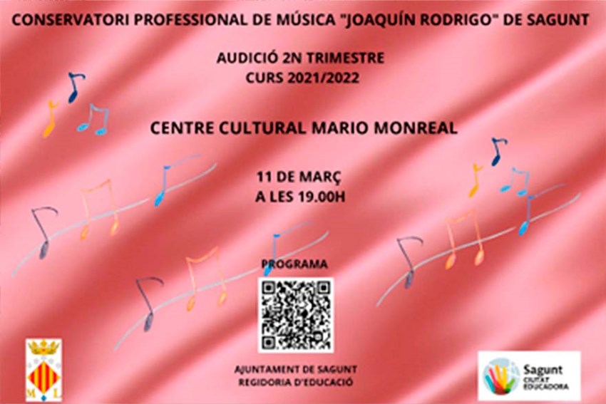 L'alumnat del Conservatori Professional de Música Joaquín Rodrigo de Sagunt oferix divendres que ve, 11 de març, la seua segona audició del curs 2021-2022 en el Centre Cultural Mario Monreal a les 19 hores.