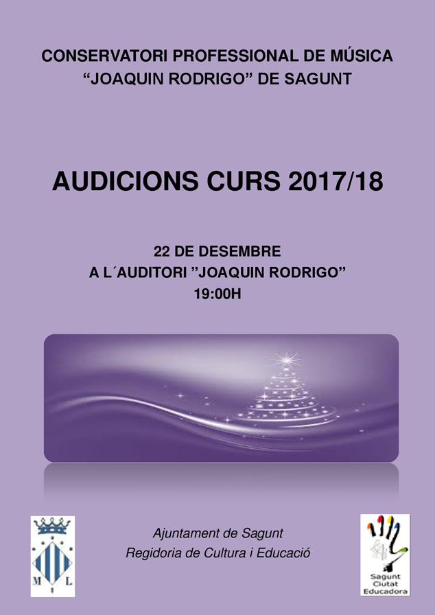 La delegació d'Educació de l'Ajuntament de Sagunt organitza les audicions del curs 2017/2018 del Conservatori Professional de Música ‘Joaquín Rodrigo’ de Sagunt. A partir de hui fins al dijous 21 de desembre, el Centre Cultural Mario Monreal acollirà les audicions dels i les alumnes, a les 19.00 hores.
