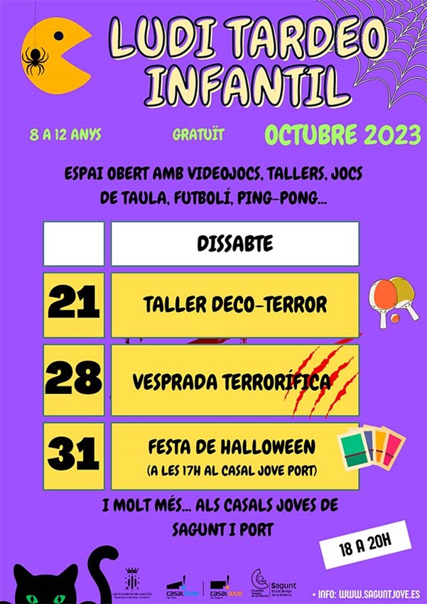Per als xiquets i les xiquetes d'entre 8 i 12 anys hi haurà taller deco-terror, vesprada terrorífica i festa de Halloween, entre altres, en horari de 18 a 20 hores els dissabtes.