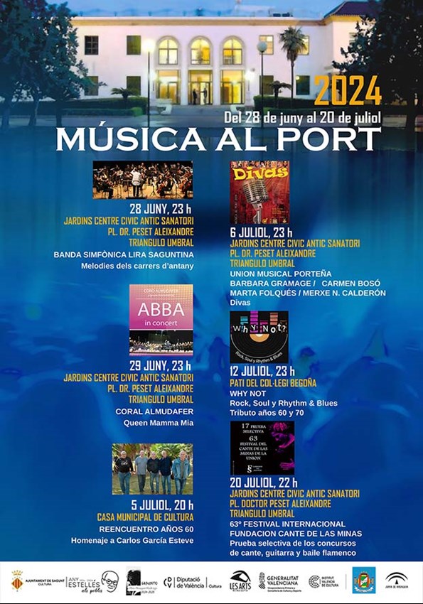 El festival Música al Port torna al municipi amb un cartell en el qual s'anuncien sis actuacions de diversos gèneres musicals programades entre el 28 de juny i el 20 de juliol. Com ja és tradició, este festival estiuenc tindrà lloc com a escenari principal als jardins del Centre Cívic Antic Sanatori, esta localització del Triangle Umbral del Port de Sagunt també ha sigut el lloc triat per a la presentació de la present edició. En l'acte ha participat l'alcalde de Sagunt, Darío Moreno, i la regidora de Cultura, Ana María Quesada, així com representants de les agrupacions participants.