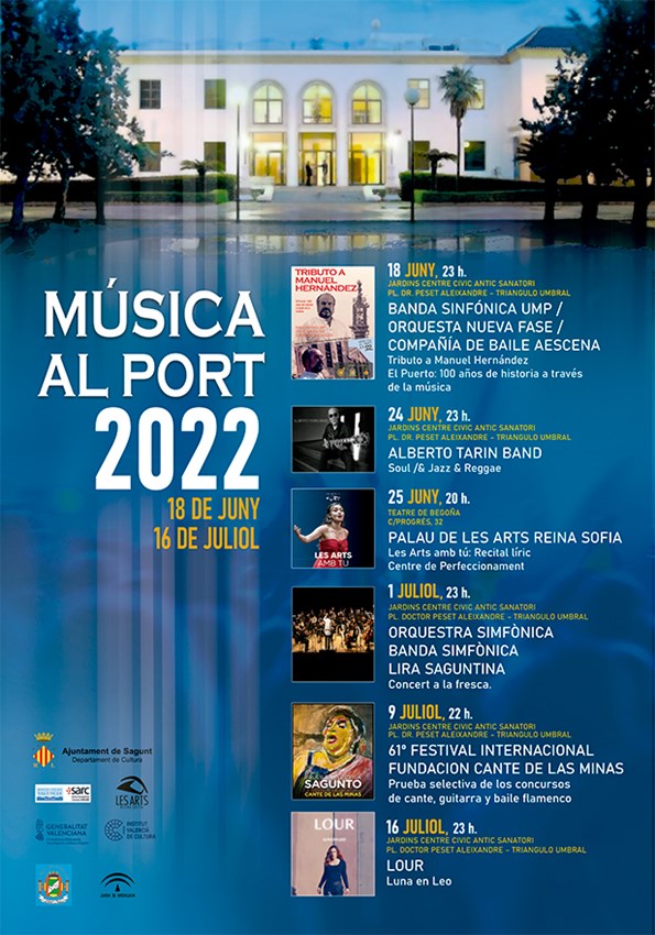 El festival Música al Port torna un estiu més amb la seua variada proposta. En esta ocasió ho farà entre el 18 de juny i el 16 de juliol i inclourà, com és habitual, les tradicionals cites a la fresca, de jazz, Les Arts amb tu i del festival de Cante de las Minas, com sempre amb entrada gratuïta.