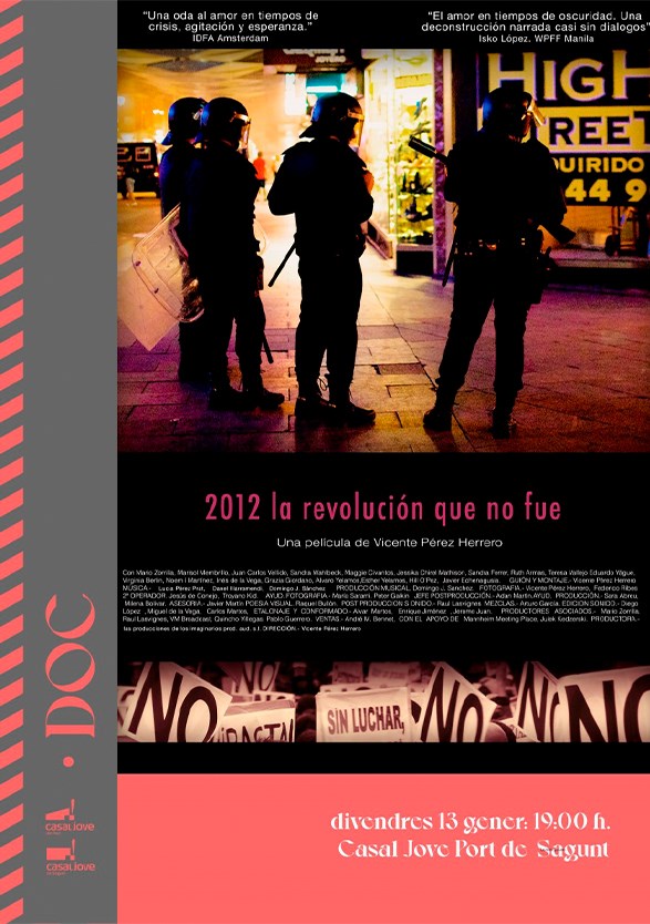 El festival de documentals PuntoDOC inicia enguany el seu cicle de projeccions amb el documental 2012 la revolución que no fue. Es tracta d’un film espanyol dirigit per Vicente Pérez Herrero (Código natural, Bestiario), que té una durada de 95 minuts.