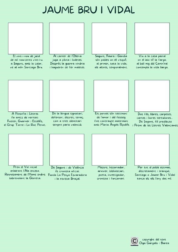 Amb motiu del centenari del naixement del poeta i historiador Jaume Bru i Vidal (1921-2000), el Gabinet de Promoció del Valencià de l'Ajuntament de Sagunt ha convocat un concurs on es premiarà l’auca que millor il·lustre la seua vida i obra, feta a partir dels dotze redolins elaborats per la professora de llengua i literatura Olga Gargallo.