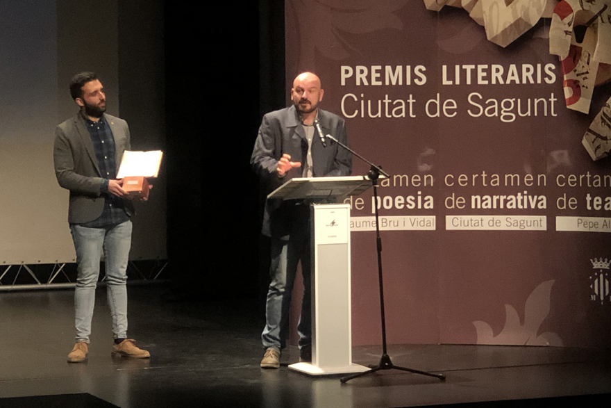L'alcalde de Sagunt, Darío Moreno (esquerra), i el guanyador del XXII premi de poesia «Jaume Bru i Vidal», Isaïes Minetto, (dreta) en el lliurament dels guardons de 2019