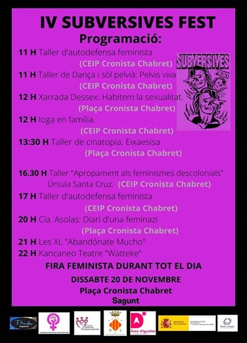 El IV Festival Subversives s'ajorna per la previsió de pluja. Esta activitat, emmarcada en la programació d'actes del 25N, està organitzada per Amigas Supervivientes, Coordinadora Feminista del Camp de Morvedre i la regidoria d'Igualtat de l'Ajuntament de Sagunt.