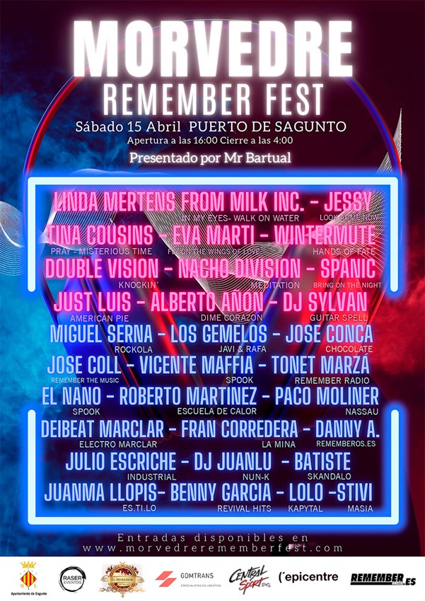 El Morvedre Remember Fest tindrà lloc dissabte que ve 15 d'abril al Port de Sagunt. El cartell d'este festival acumula un total de 30 artistes que cantaran i punxaran música remember dels anys 90 i 2000 des de les 16.00 fins a les 04.00 en un espai habilitat per a tal efecte pròxim a la Plaça de la Concòrdia. L'alcalde de Sagunt, Darío Moreno, i el regidor de Joventut de l'Ajuntament de Sagunt, Guillermo Sampedro, han presentat l’event amb els organitzadors.