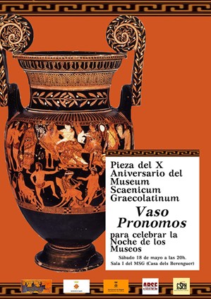 El dissabte 18 de maig, a partir de les 20 hores, tindrà lloc la celebració de la Nit dels Museus a la sala I del Museu de l'Escena Grecollatina. Durant esta segona activitat es presentarà una rèplica del Got Pronomos, una peça de ceràmica pertanyent al Museu Arqueològic Nacional de Nàpols en el qual apareix la figura del déu Dionisi i de la deessa Ariadna.