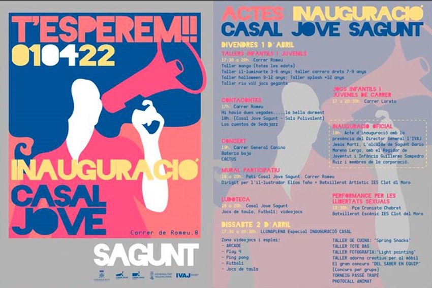 La inauguració del Casal Jove de Sagunt, emplaçat en l'edifici adquirit i remodelat per l'Ajuntament de Sagunt de l'antiga seu de l'ONCE, situt concretament al carrer José Romeu, tindrà lloc divendres que ve, 1 d'abril, a las 18 horas. Així mateix, a partir de las 17 horas, hola programa una gran oferta de actividades y servicios destinados a la població més jove del nucli històric de la ciutat.