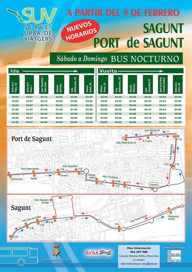 Els nous horaris del servici i parades del Bus de Nit que presta l'Ajuntament de Sagunt estaran disponibles a partir del pròxim diumenge, 9 de febrer. Este servici es desplaça des de Sagunt al Port de Sagunt cada matinada de dissabte i diumenge. La finalitat d'estes noves mesures és adaptar-lo a les demandes dels usuaris, principalment els jóvens de la ciutat, que sol·licitaven novetats i una ampliació del servici que el fera més efectiu. Els desplaçaments es realitzaran pels dos nuclis, des del centre històric fins a les zones d'oci de la localitat.