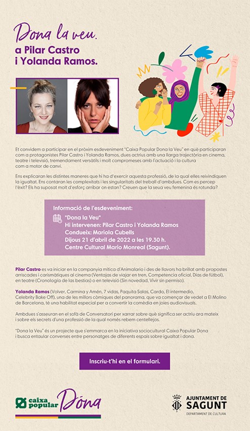 “Dona la Veu” és un projecte organitzat per la iniciativa sociocultural “Caixa Popular Dona” en col·laboració amb el departament de Cultura de l'Ajuntament de Sagunt.