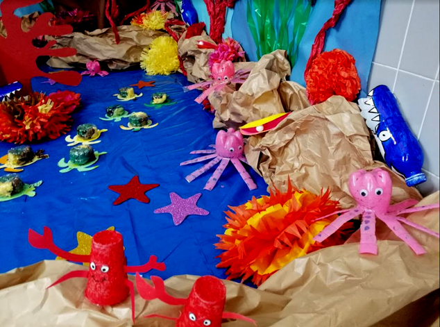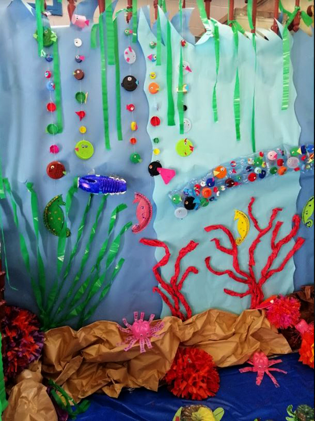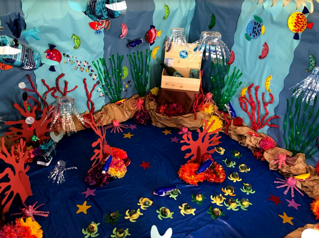 Els estudiants del primer col·legi a rebre'l, el CEIP Cronista Chabret, han decorat un espai en el seu centre dedicat al món marí, en el qual tots els elements simulen animals i plantes aquàtiques, realitzats tots ells amb material reciclat. Els escolars han transformat garrafes d'aigua en closques de tortugues marines, botelles en meduses i plats d'un sol ús en cavallets marins.