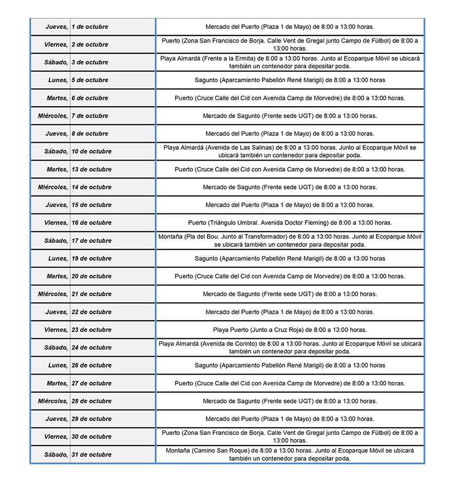 Durant el mes d'octubre els servicis que presta l’ecoparc mòbil estaran situats en zones de Sagunt, Port de Sagunt, platja d'Almardà i zones de muntanya, en l'horari de 8 a 13 hores. De manera concreta, a Sagunt esta instal·lació estarà els dies 5, 19, 26 en la zona de l'aparcament del pavelló René Marigil i, durant els dies de mercat exterior, 7, 14, 21 i 28 d'octubre, enfront de la seu de la Unió General de Treballadors (UGT).
