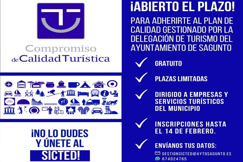 El procés d'adhesió de les noves empreses i servicis ha començat per a totes aquelles que vulguen participar en SICTED Sagunt 2023. El termini estarà obert fins al dimarts 14 de febrer i la inscripció és totalment gratuïta, ja que les despeses derivades del projecte són finançades per la Conselleria de Turisme i l'Ajuntament de Sagunt.
