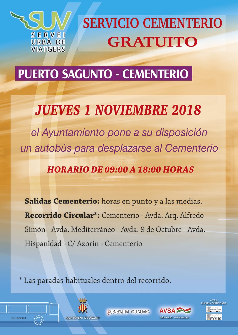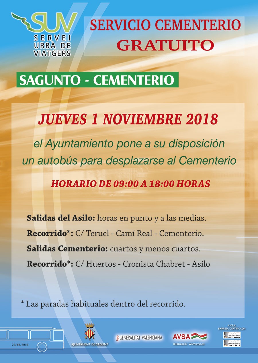- L'autobús de Sagunt eixirà a les hores en punt i a les mitges de l'asil, amb direcció al cementeri, amb el recorregut habitual de: “asil – cl. Teruel-Cami Real- cementeri – av. Pais Valencià- cl. Horts- Pz. Cronista Chabret – av. Doctor Palos- asil”.