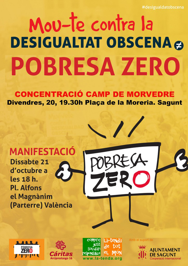 Des de La Tenda de Tot el Món fan una crida a la ciutadania i a les entitats comarcals per participar. A més, demà dissabte, 21 d'octubre, serà la manifestació de Pobresa Zero a València. “Mou-te contra la desigualtat obscena” és el lema que se sentirà en l'esdeveniment. La convocatòria de la Coordinadora Valenciana d’ONGD i la plataforma valenciana Pobresa Zero, de les quals forma part l’ONGD La Tenda de Tot el Món, és a les 18.00 h des de la plaça Alfons el Magnànim.