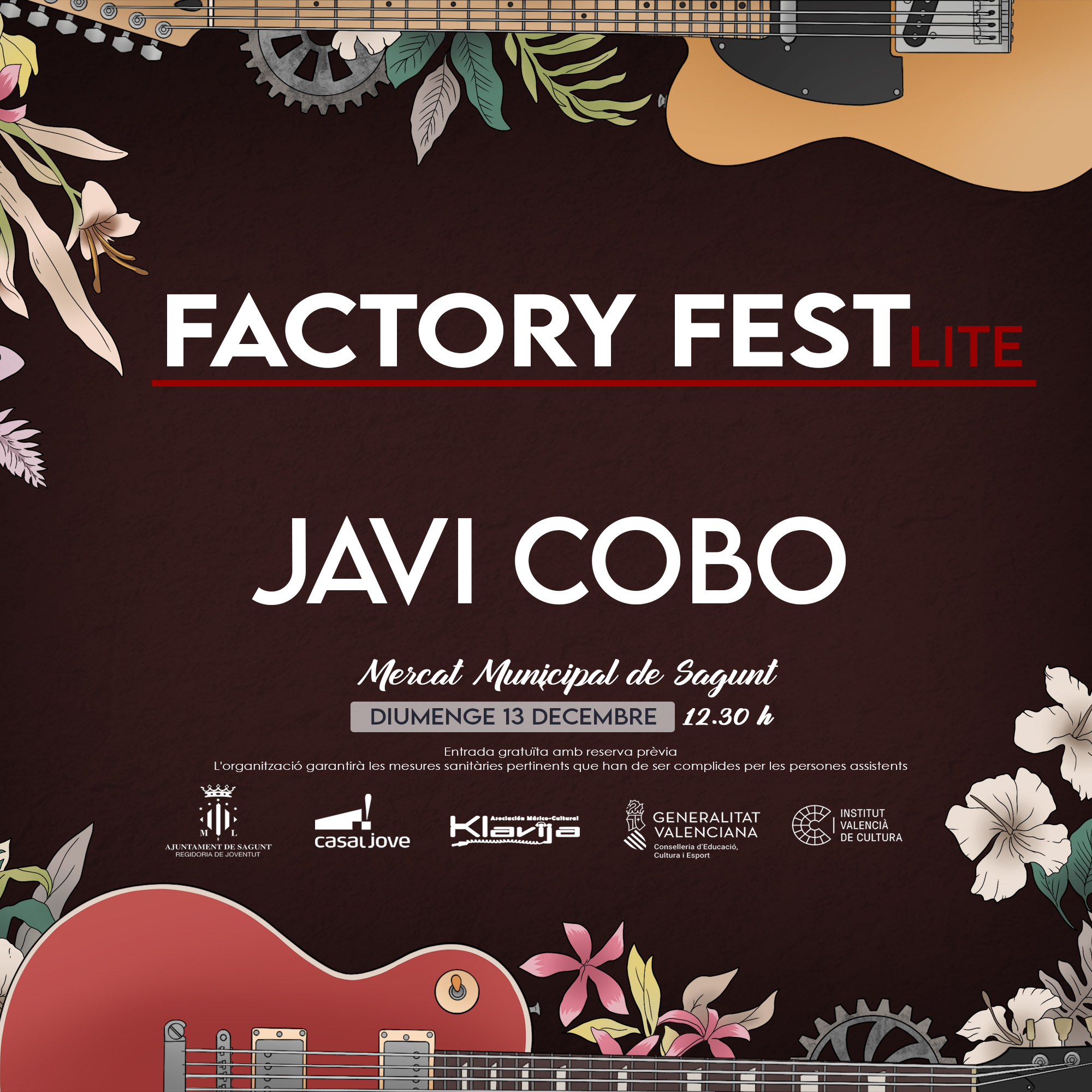 Respecte al diumenge, serà el torn del cantautor local Javi Cobo, que actuarà en el mercat municipal de Sagunt a les 12.30 hores. Javi Cobo oferirà un concert amb la seua guitarra i predominaran ritmes com la rumba. Esta actuació s'emmarca en el Factory Fest Lite, el cicle de concerts organitzats per la regidoria de Joventut que compta amb músics locals menors de 30 anys. Es preveu que este cicle s'allargue, almenys, fins a abril del pròxim any 2021.