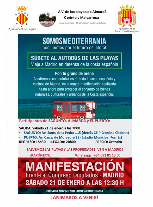 L'Associació de Veïns de les platges d’Almardà, Corinto i Malva-rosa ha organitzat, amb la col·laboració de l'Ajuntament de Sagunt i l'Ajuntament de Canet d'en Berenguer, un ‘autobús de les platges’ que viatjarà fins a Madrid per a la manifestació en defensa de la costa espanyola.