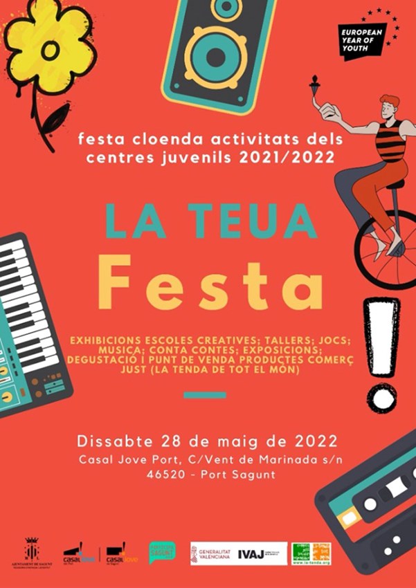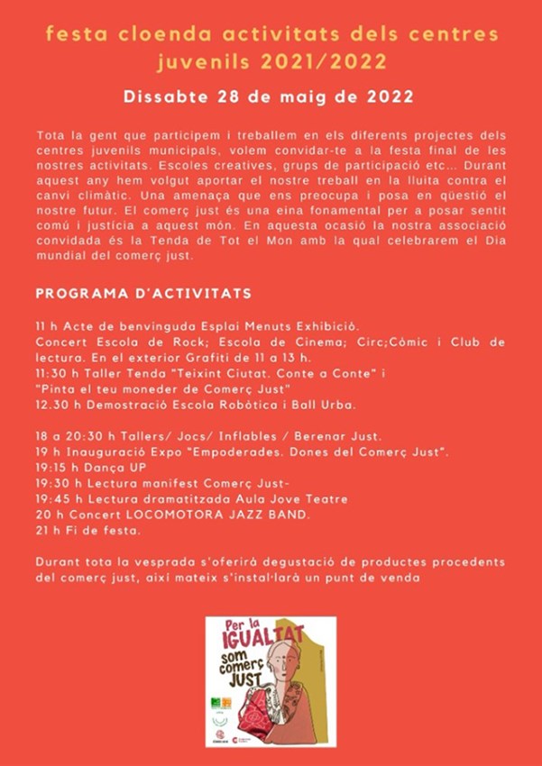 El Departament de Joventut celebrarà este dissabte, 28 de maig, la festa de clausura de les activitats dels centres juvenils del present curs 2021/2022 amb una jornada que comptarà amb exhibicions de les escoles creatives, tallers, jocs, música, contacontes, exposicions i degustació i punt de venda de productes de comerç just.