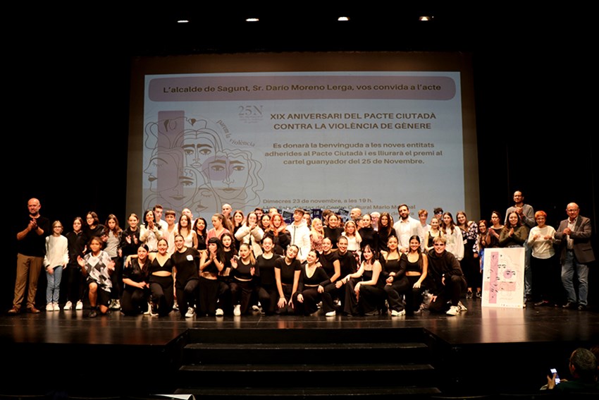 El Pacte Ciutadà contra la Violència de Gènere a Sagunt va celebrar este dimecres el seu XIX aniversari amb una gala que va conjuminar la reivindicació per la igualtat i enfront de les violències contra les dones mitjançant actuacions teatrals, performances, música i dansa i en què es van adherir huit noves entitats. Així mateix, es va lliurar el guardó a la guanyadora del premi al cartell per al 25N d'enguany, Maria Jesús Penya López.