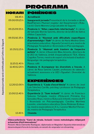 Al llarg del matí hi haurà diverses ponències com “Altes capacitats intel·lectuals”, a càrrec del director de la UEO de Xàtiva d'Altes Capacitats, Salvador Borrás Sanchis, o “Acompanyar les diversitats de l'escola” a càrrec de l'assessora de la UEO d'Igualtat i Diversitat de València, Rosa Sanchis Caudet.