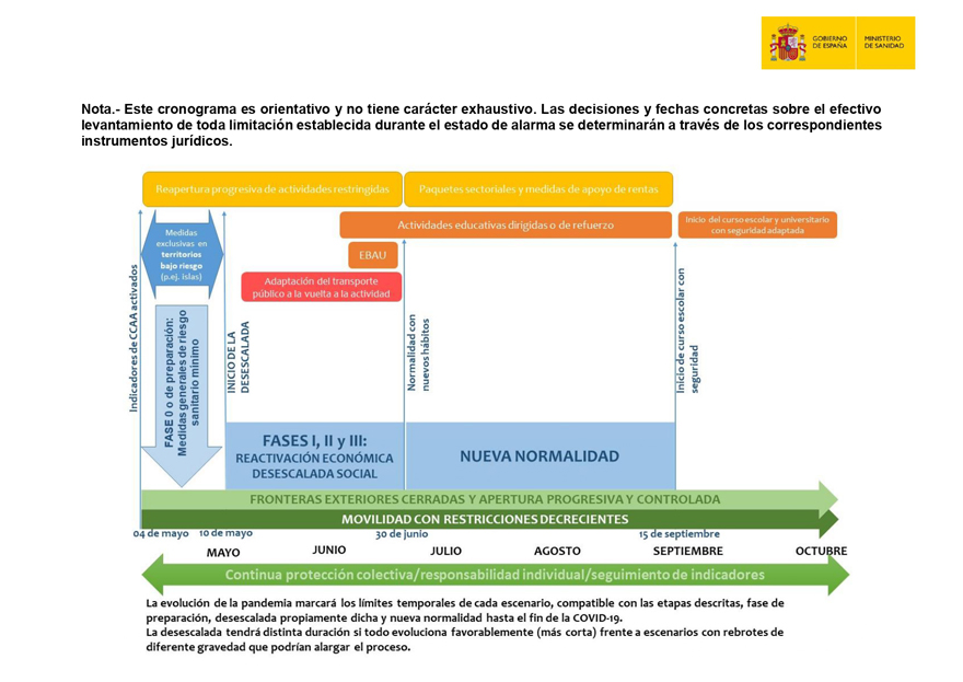 El Govern d'Espanya ha impulsat un pla de desescalada compost per quatre fases la successió de les quals dependrà de com evolucione la covid-19 i la disminució de la seua propagació. L'objectiu d'este Pla és la Transició Escalonada cap a una Nova Normalitat, tractant de recuperar la vida quotidiana, en la mesura que siga possible, i protegint la salut pública. És important destacar que es tracta d'un procés de desescalada que ha de ser gradual, asimètric, coordinat amb les comunitats autònomes, i adaptable als canvis d'orientació necessaris en funció de l'evolució de les dades epidemiològiques i de l'impacte de les mesures adoptades, segons s'indica en el citat pla.