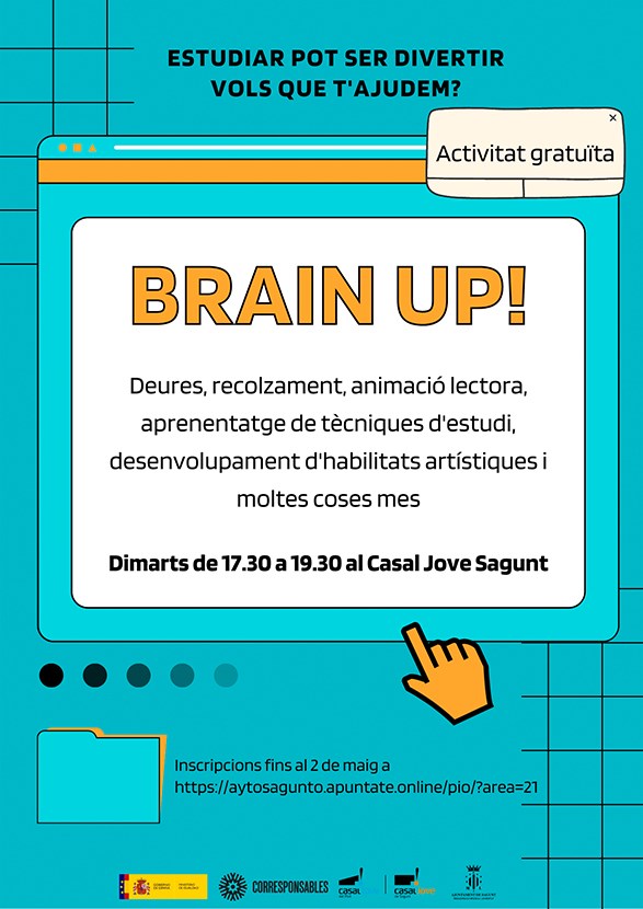 El Casal Jove de Sagunt, recentment inaugurat i cofinançat pel fons FEDER de la Unió Europea, estrena Brain Up!, la nova activitat de reforç escolar que es duu a terme des de la regidoria de Joventut i Infància de l'Ajuntament de Sagunt.