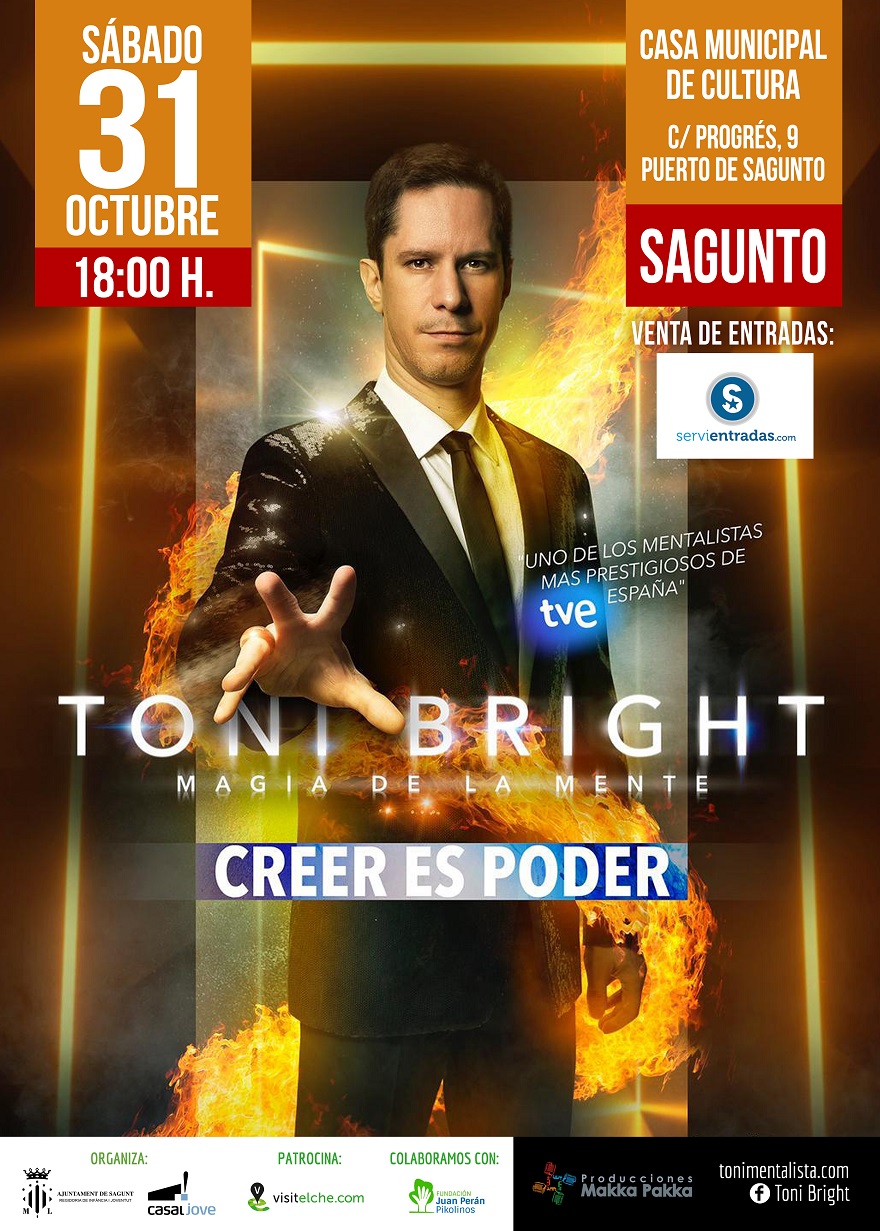 La Casa de Cultura del Port de Sagunt acollirà el 31 d'octubre, a les 18.00 hores, el nou espectacle de Toni Bright, el millor mag i mentalista d'Espanya amb Creer es poder. Una experiència increïble amb un nou espectacle per descobrir. En este cas l'espectacle estarà dirigit a públic familiar i a majors de 7 anys. Les entrades es poden adquirir en www.servientradas.com.